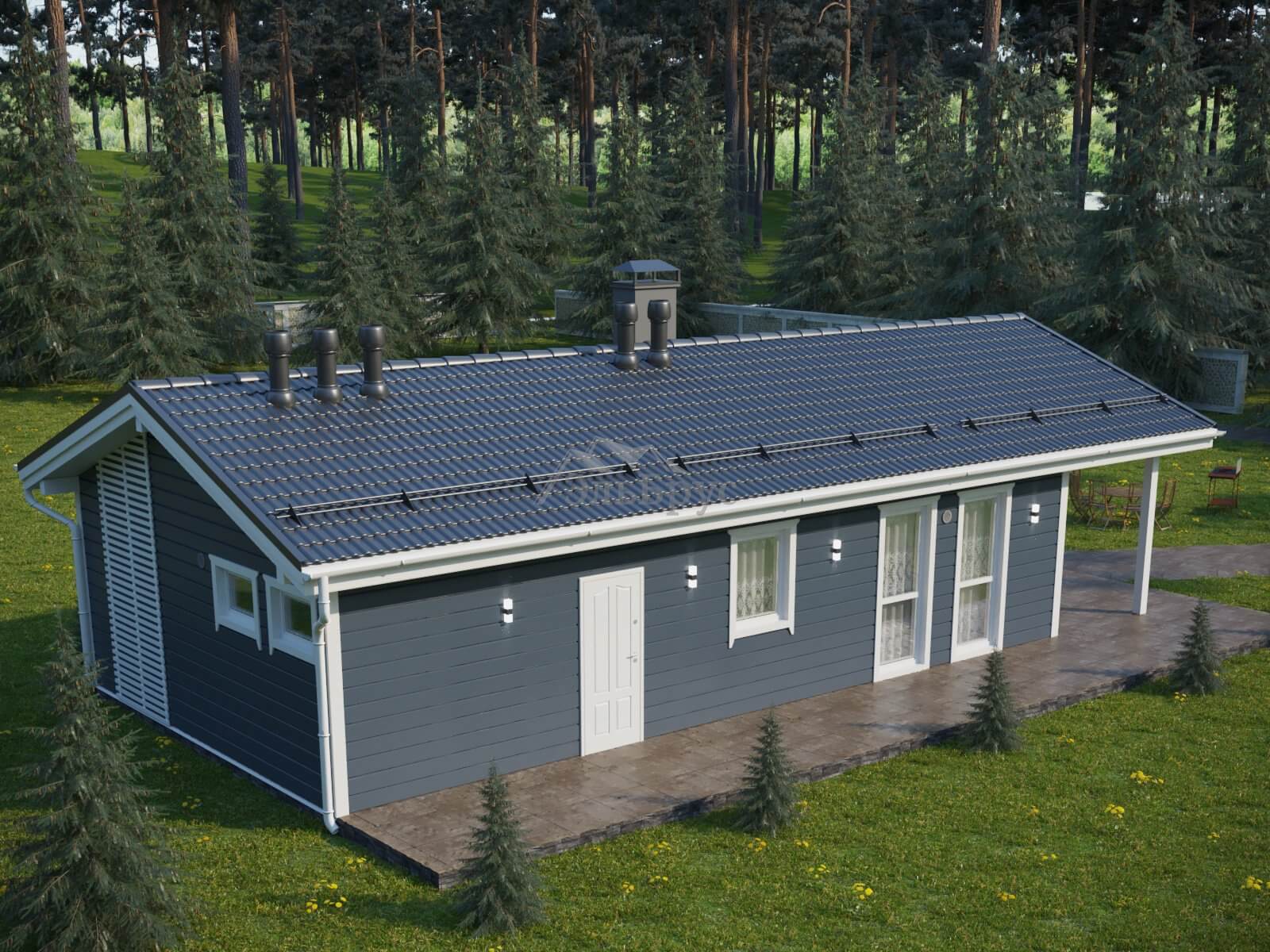 Современный одноэтажный каркасный дом КД 062 с двумя спальнями, просторной кухней-гостиной, санузлом, сауной и хозяйственным помещением. Все пространства подчинены абсолютной гармонии. Огромная терраса создана специально для тех, кто хочет много времени проводить на природе. Большое количество окон позволяет наполнить все помещения достаточным источником света. А современные материалы и архитектурные решения подчеркивают отточенную стилистику дома и его продуманную функциональность. Ценителям простора и комфорта данный проект придется по вкусу.