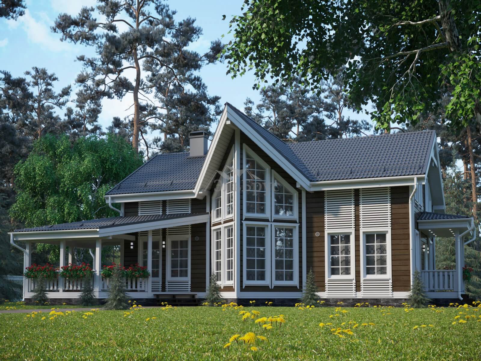 Этот современный просторный каркасный дом прекрасно подходит для нашего климата – когда солнечных дней не так много. Крыша с высокими коньками придает архитектурному решению дома изысканность и завершенность. Так что члены семьи могут выбрать для себя комнату по своему желанию: с более высокими потолками – или же наоборот, с более низкими, создающими ощущение уютной мансарды. Преимуществом этого проекта является светлая просторная кухня-гостиная на первом этаже, которая надежно защищена от холода и сквозняков тамбуром, где можно также обустроить и дополнительное место для хранения. Огромная терраса точно понравится тем, кто привык собираться всей семьей и пить чай на открытом воздухе. А крытый навес террасы не позволит испортить ваш отдых даже в дождливый и ненастный день.